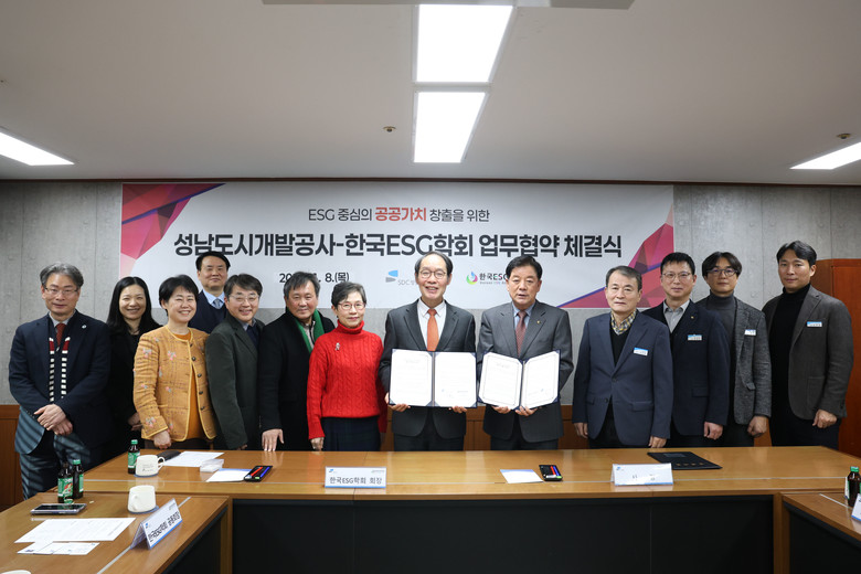 | ▲성남도시개발공사가 (사)한국ESG학회와 업무협약을 체결하고 기념 촬영을 하고 있다.(사진=성남도시개발공사) |