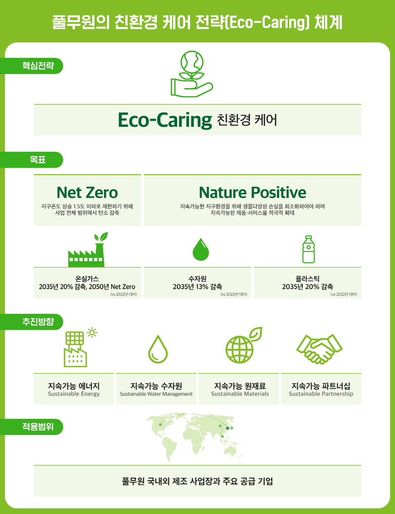 풀무원은 창사 40주년을 맞아 지속가능한 지구 환경에 기여하기 위해 기존 친환경(Eco-Friendly) 전략에서 보다 실천적 의미를 강조한 ‘친환경 케어(Eco-Caring)’ 전략을 선언하고, 넷 제로와 네이처 포지티브를 실현하기 위해 ‘온실가스’, ‘수자원’, ‘플라스틱’ 감축에 대한 중장기 목표와 로드맵을 수립하여 풀무원 국내외 제조 사업장과 주요 공급 기업에서 추진해 나가기로 했다고 31일 밝혔다.
