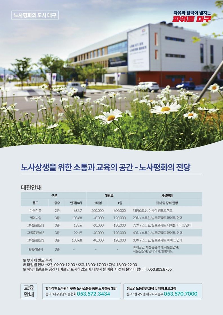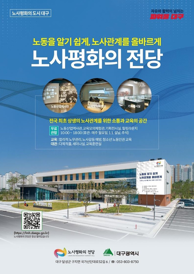 한편, 노사평화의 전당은 전국 최초로 세워진 노사상생의 소통과 교육 공간으로 우리나라 노동의 역사를 한눈에 볼 수 있는 노동역사관과 개항기부터 최근까지의 산업의 변천사를 보여주는 산업역사관을 비롯해 대구관, 직업 모의 체험관 등 다양한 콘텐츠를 노동문화 해설사의 안내와 함께 무료로 경험해 볼 수 있는 곳이다.