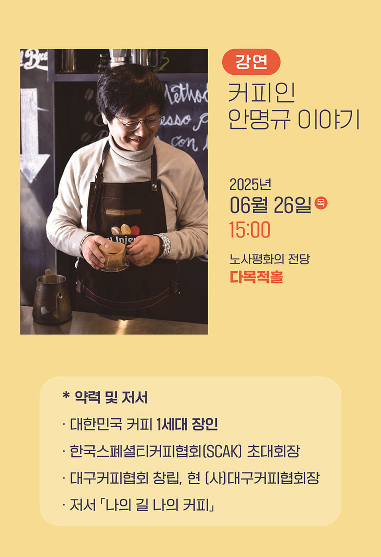 전시회 첫째 날인 6월 26일(목) 오후 3시 노사평화의 전당 다목적홀에서는 대구시립교향악단의 연주와 ‘나의 길 나의 커피’의 저자인 (사)대구커피협회 안명규 대표의 커피에 대한 특별강연도 있을 예정이다.