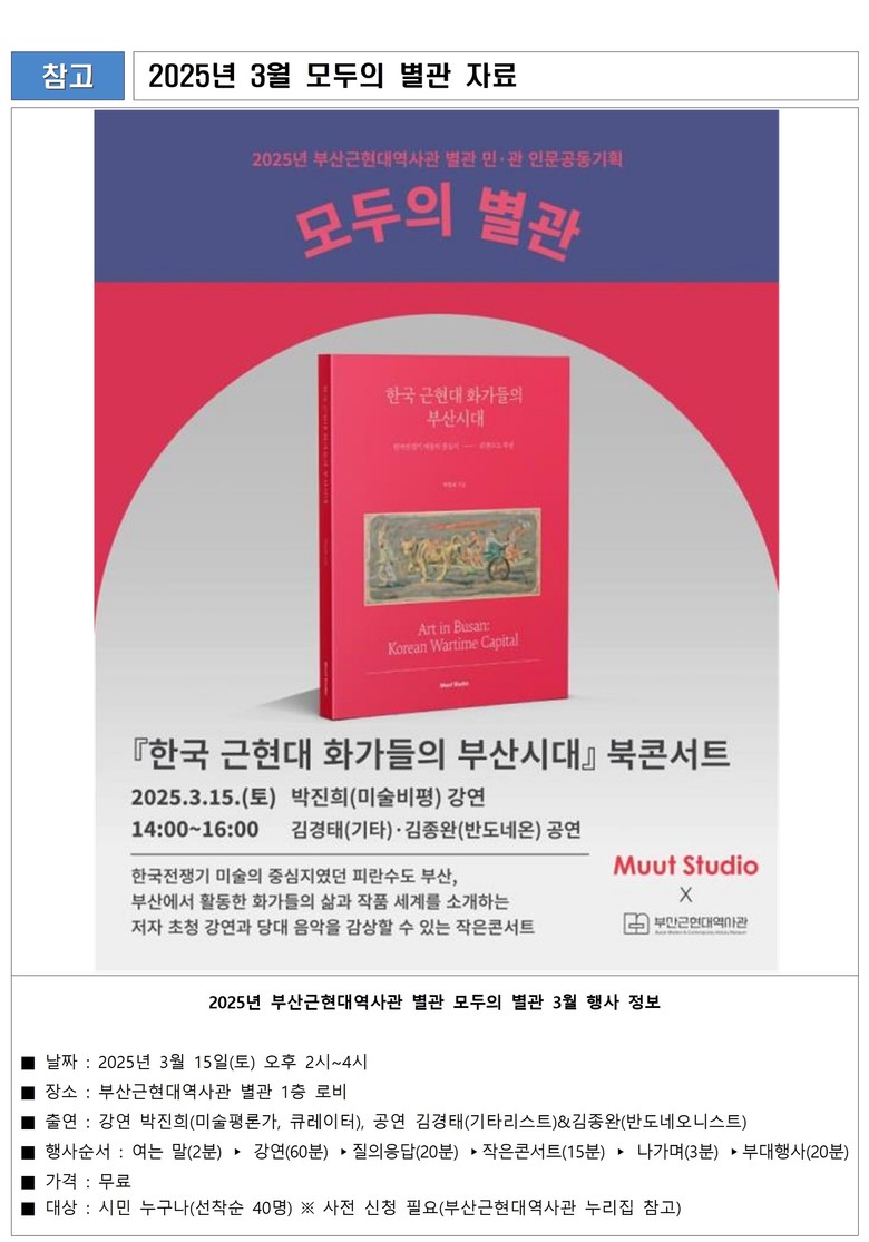 오는 3월 행사는 뮤트스튜디오에서 지난해 12월 발행한 책 『한국 근현대 화가들의 부산시대』(부제: 한국전쟁기 미술의 중심지 피란수도 부산)를 다룬 강연을 선보인다. 이날은 책의 저자이자 미술비평가이며 큐레이터인 박진희가 강연자로서 무대에 선다.