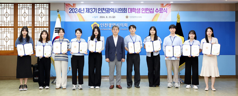 인천시의회는 23일 접견실에서 정해권 의장을 비롯해 김상섭 사무처장, 대학생 인턴 10명 등이 참석한 가운데 ‘제3기 대학생 인턴 수료식’을 개최했다.