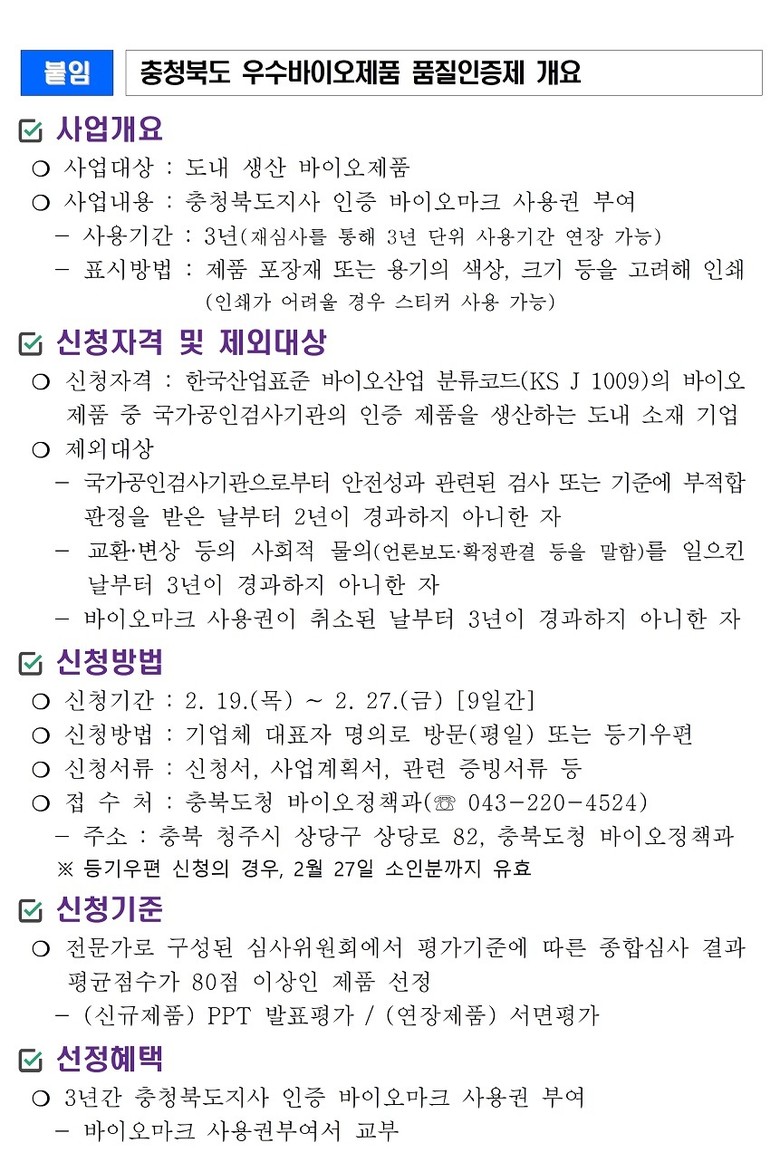 ‘우수바이오제품 품질인증제’는 충북도가 바이오산업 육성을 위해 지난 2008년부터 시행해 온 제도다. 품질과 안전성을 갖춘 제품을 선정해 도지사 인증마크(바이오마크)를 부여하며, 기업은 제품 포장이나 용기에 인증마크를 표시해 소비자 신뢰를 확보할 수 있다.