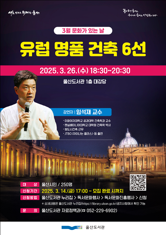 울산도서관 관계자는 “이번 강연을 통해 건축을 단순한 건물이 아닌 시대와 문화, 그리고 사람의 삶과 연결된 예술작품으로 바라볼 수 있는 기회를 가짐과 동시에 문화적 경험의 하나로 시민들에게 일상 속 휴식이 되길 바란다”라고 말했다.