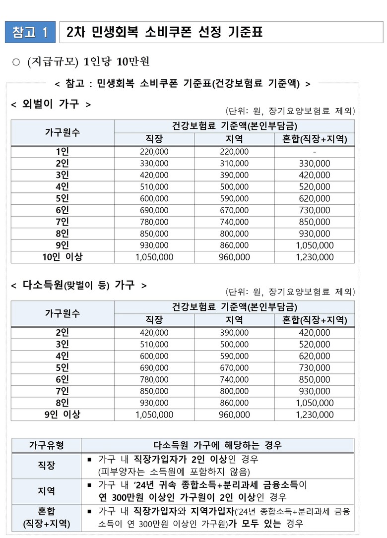 ◈ 지급대상은 가구 합산 소득 상위 10퍼센트(%)를 제외한 전 국민… 2025년 6월 부과 건강보험료 본인부담금이 가구원 수별·유형별 기준액 이하인 경우 해당