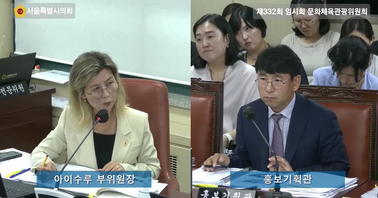 특히, 당일 상임위 조례 심사에서 시민청에서 도시갤러리로 명칭 변경을 하고자 서울시장이 발의해 보류된 ’서울특별시 시민청 운영 및 관리 조례 전부개정조례안‘과 관련하여, 아이수루 의원은 “기존 시민청의 경우, ’시민 참여와 소통‘을 강조한 반면, ’서울갤러리‘는 도시홍보를 시민참여보다 선순위로 강조했다”며 해당 사유를 질의했다.