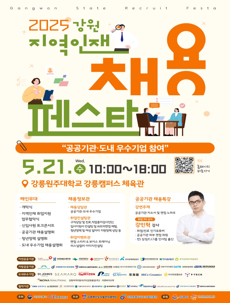 행사 프로그램은 공공기관 채용 특강과 신입사원 토크콘서트로 시작되며, 이어서 강원권 주요 9개 대학과 고용노동부, 강원특별자치도경제진흥원, 강원혁신도시발전지원센터 간 지역인재 취업 지원을 위한 업무협약(MOU) 체결식이 진행된다.