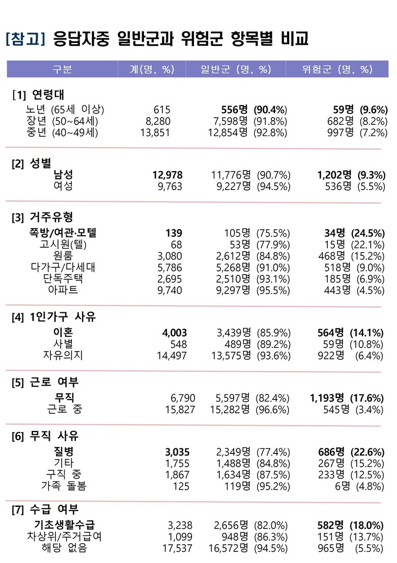 쪽방·여관(24.5%)과 고시원(22.1%) 등 주거 취약지에 거주하는 가구에서 고위험군 비율이 두드러졌고, 원룸(15.2%)과 다가구·다세대 주택(9.0%) 순으로 조사됐다.