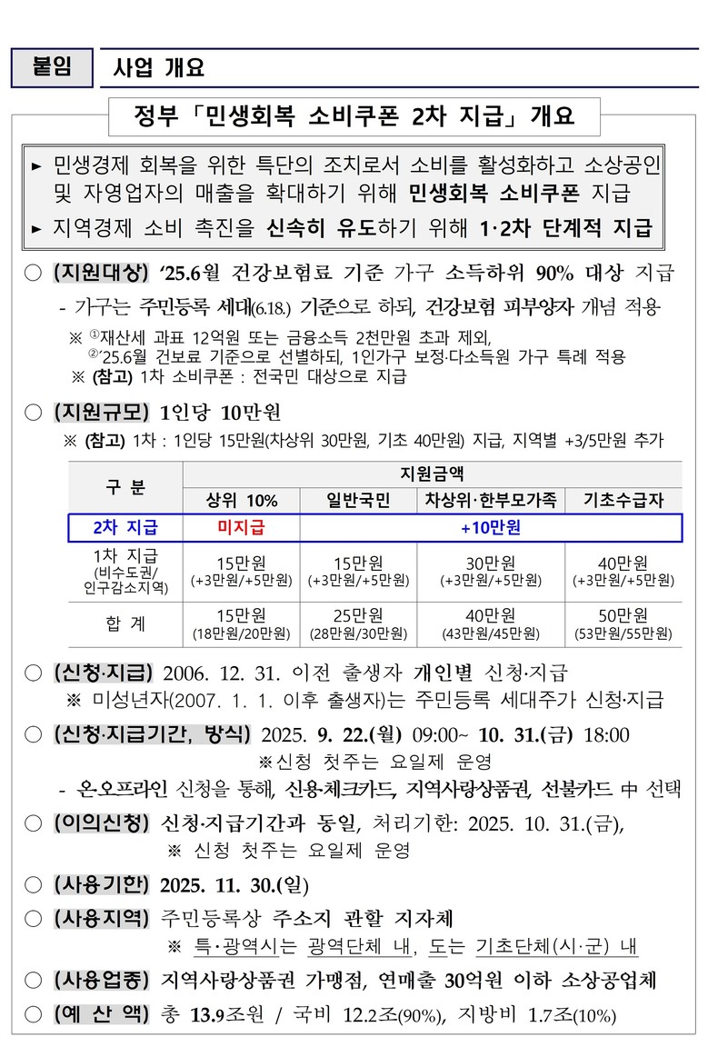 신청 기간은 9월 22일부터 10월 31일까지로, 신청일 다음 영업일에 충전되어 바로 사용할 수 있다. 지급된 소비쿠폰은 11월 30일까지 사용 가능하며, 기한 내 사용하지 않으면 자동 소멸된다.