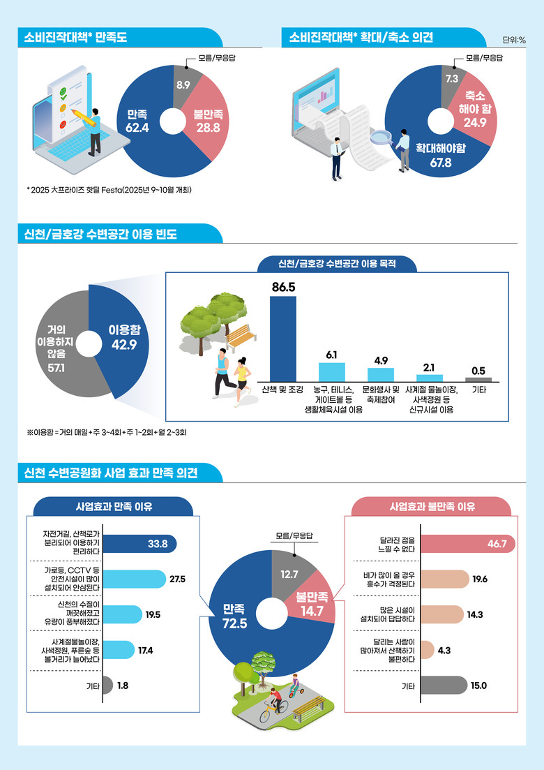 신천 수변공원화 사업*에 대한 만족도 조사 결과, 72.5%의 시민들이 ‘만족한다’고 답했으며, 만족 이유로는 ‘자전거길, 산책로가 분리되어 이용하기 편리하다’(33.8%), ‘가로등, CCTV 등 안전시설이 많이 설치되어 안심된다’(27.5%) 등이 꼽혔다.