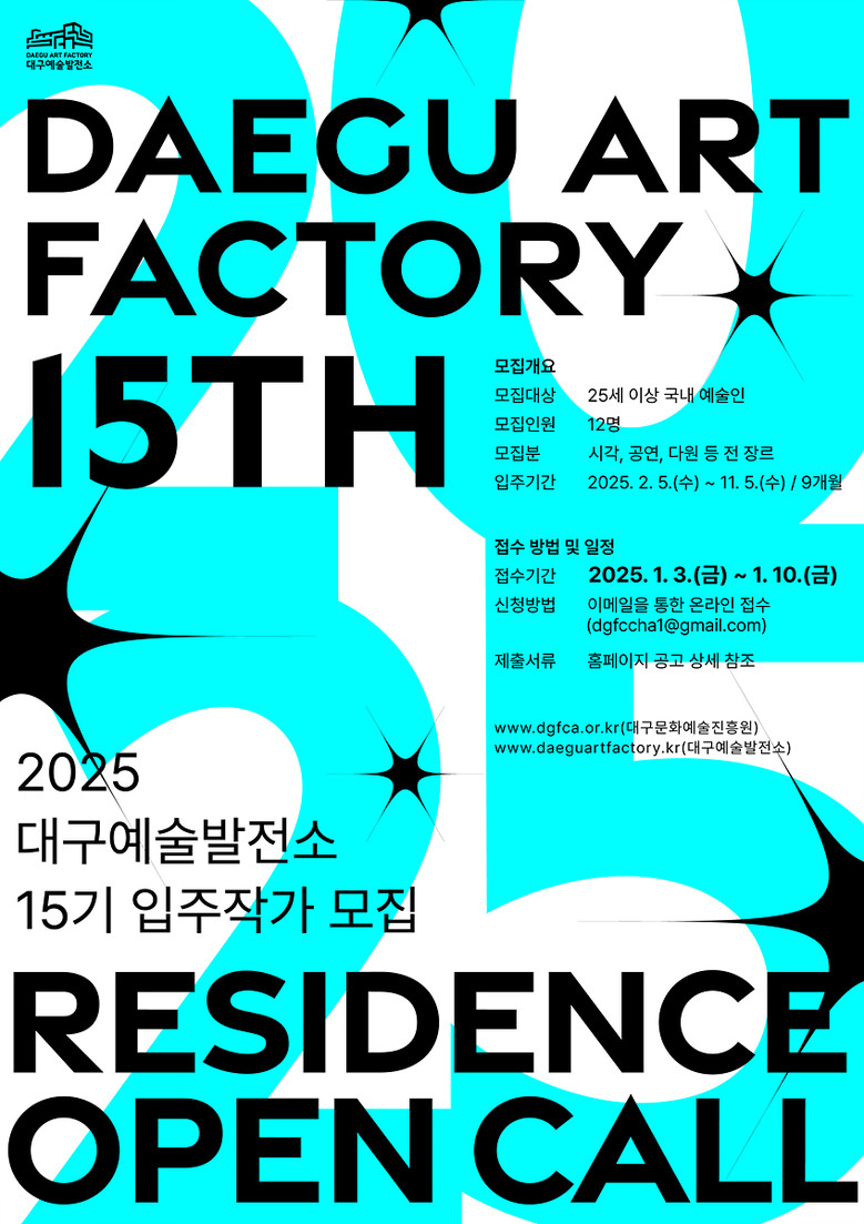 대구예술발전소는 작업의 질적 성장 및 발전 방향성 구축을 위해 다양한 프로그램 및 창작활동을 지원하는 레지던시 입주작가 모집을 12월 23일(월) 공고 후, 2025년 1월 3일(금)부터 1월 10일(금) 오후 6시까지 이메일(dgfccha1@gmail.com)을 통한 온라인 접수로 진행한다.