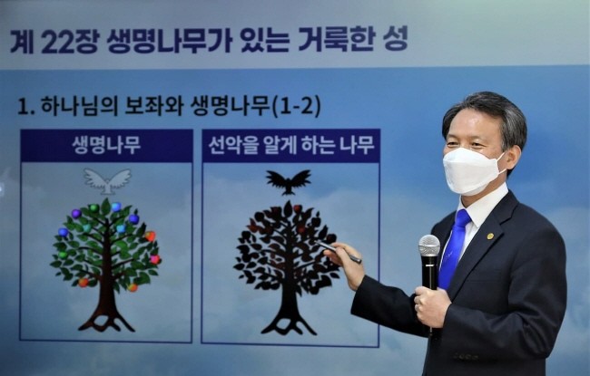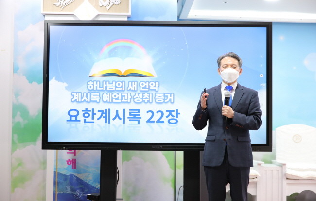 [세계타임즈 백진욱 기자] 신천지(총회장 이만희, 이하 신천지예수교 증거장막성전)가 ‘하나님의 새 언약 계시록 예언과 성취 증거’ 세미나를 통해 세계 최초 요한계시록의 말씀을 알리는 가운데, 유영주 서울야고보지파장이 23일 요한계시록의 마지막 장인 22장 강의에 나섰다.
