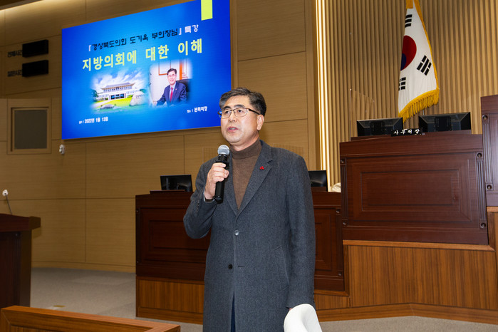 [경북=세계타임즈 한성국 기자] 경상북도의회 도기욱 부의장은 1월 13일(목) 경상북도의회 세미나실에서 지방선거출마 희망자를 비롯한 정치지망생인 제2기 영남일보 지방아카데미 회원 30여명을 대상으로 특강을 진행하였다.