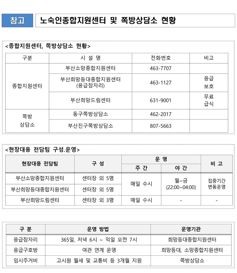 한편, 시는 노숙인종합지원센터 3곳과 쪽방상담소 2곳을 쉼터로 운영하고 있다. 특히 좌천동 소재 부산희망드림센터는 휴일 없이 매일 2회(중·석식) 무료 급식을 제공해 한파 취약계층의 기본 돌봄 기능을 담당하고 있다.