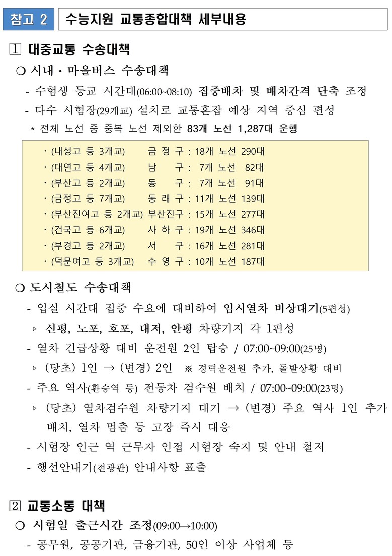 [수송지원] 수험생 수송지원을 위해서 시험 당일 오전 6시부터 8시 10분 사이 시내버스와 마을버스를 집중적으로 배차하고, 시험장이 몰려있어 교통 혼잡이 우려되는 지역의 83개 노선버스는 해당 시간 배차 간격을 단축 운영하며, 도시철도 임시열차(5편성)도 비상 대기한다.