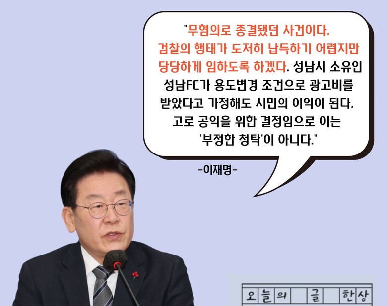 검찰출석에 이 대표는 "무혐의로 종결됐던 사건이다. 납득이 어렵지만 당당하게 임하도록 하겠다.” 고 말하며 ”성남FC가 광고비를 받았다고 가정해도 시민의 이익이 된다, 고로 공익을 위한 결정임으로 이는 '부정한 청탁'이 아니다."며 결백을 주장했다.