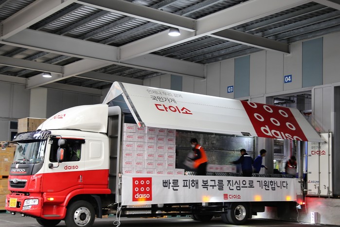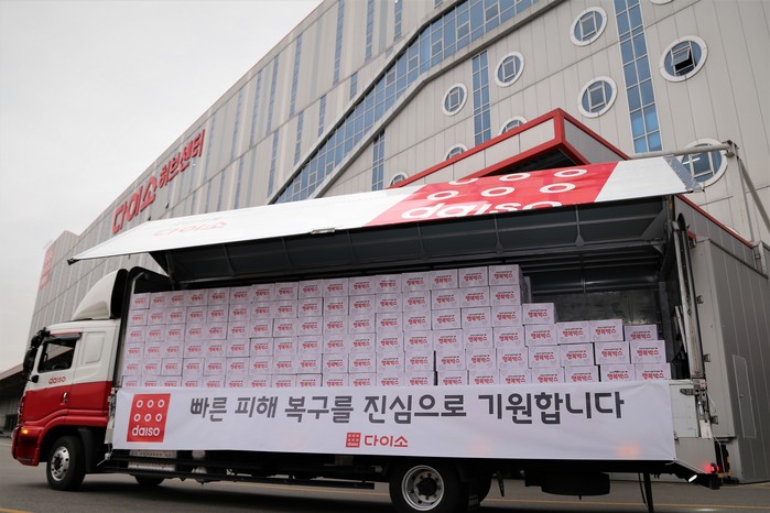 다이소는 7일 오전 화재로 큰 피해를 입은 이재민 가족들을 위해 주요 생필품이 담긴 행복박스 1,000가족분을 속초시청과 고성군청에 전달했다.