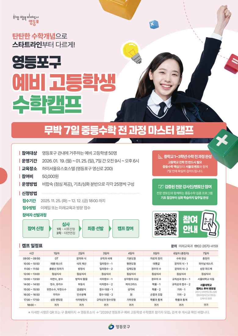- 서울대 출신 멘토 1:1 상담, 서울대 캠퍼스 투어 진행 [영등포구 세계타임즈=이장성 기자] 영등포구(구청장 최호권)가 고등학교 진학을 앞둔 관내 중학생을 대상으로 ‘예비 고등학생 수학캠프’를 운영하고, 12월 12일까지 참가자 50명을 모집한다고 밝혔다.