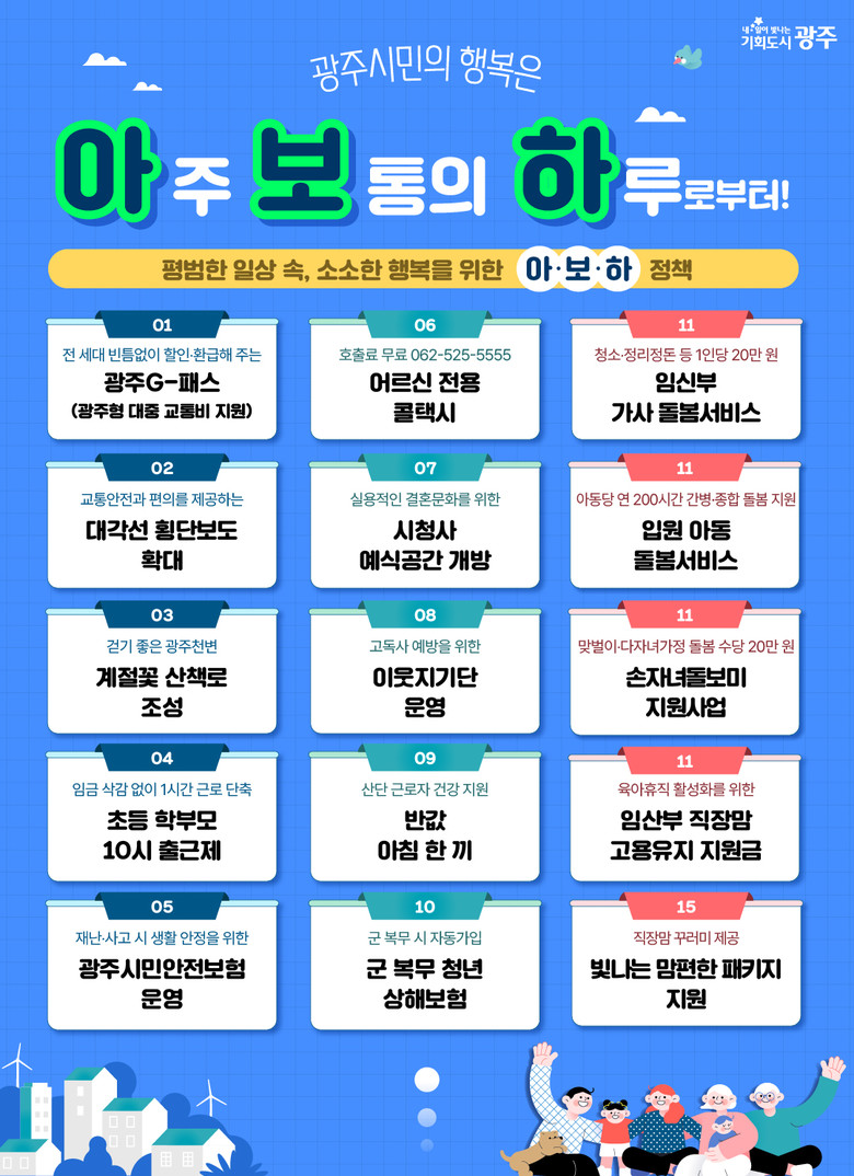 광주G-패스(광주형 대중교통비 지원) 도입, 대각선 횡단보도 확대, 어르신 전용콜택시 운영, 시청사 예식공간 개방, 임신부 가사돌봄, 손자녀가족돌보미, 시민안전보험, 군복무청년 상해보험 지원, 광주천변 계절꽃 산책로 조성 등은 시민들에게 소소한 행복과 힐링을 위한 정책들이다.
