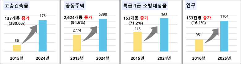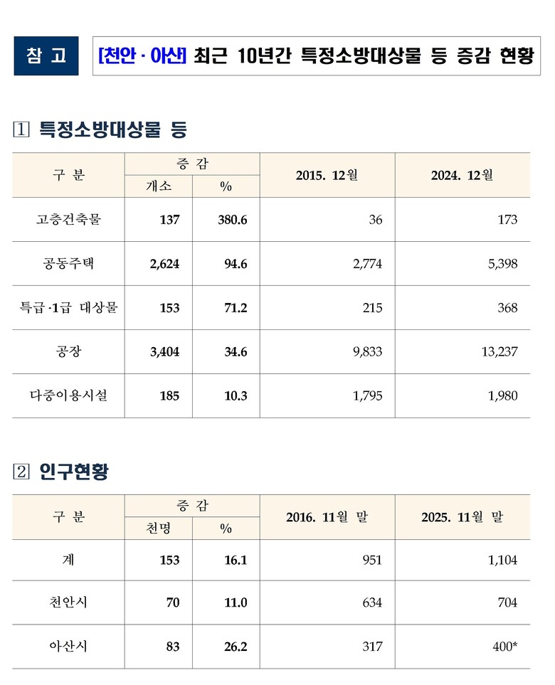 천안‧아산권은 수도권 인접성과 교통‧물류 중심 거점 도시로 성장하며 최근 10년간 인구 증가 16.1%, 공동주택 94.6%, 고층 건축물 380.6%, 특급.1급 소방대상물 71.2%, 공장 34.6%, 다중이용시설 10.3% 등 주요 시설이 빠르게 확장되고 있는 지역이다.