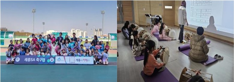 | ▲ (좌측)세종SA축구단 홈경기에서 축하공연을 한 해밀치어리딩팀, (우측)학부모 풍물동아리가 운영하는 어린이 풍물팀 |