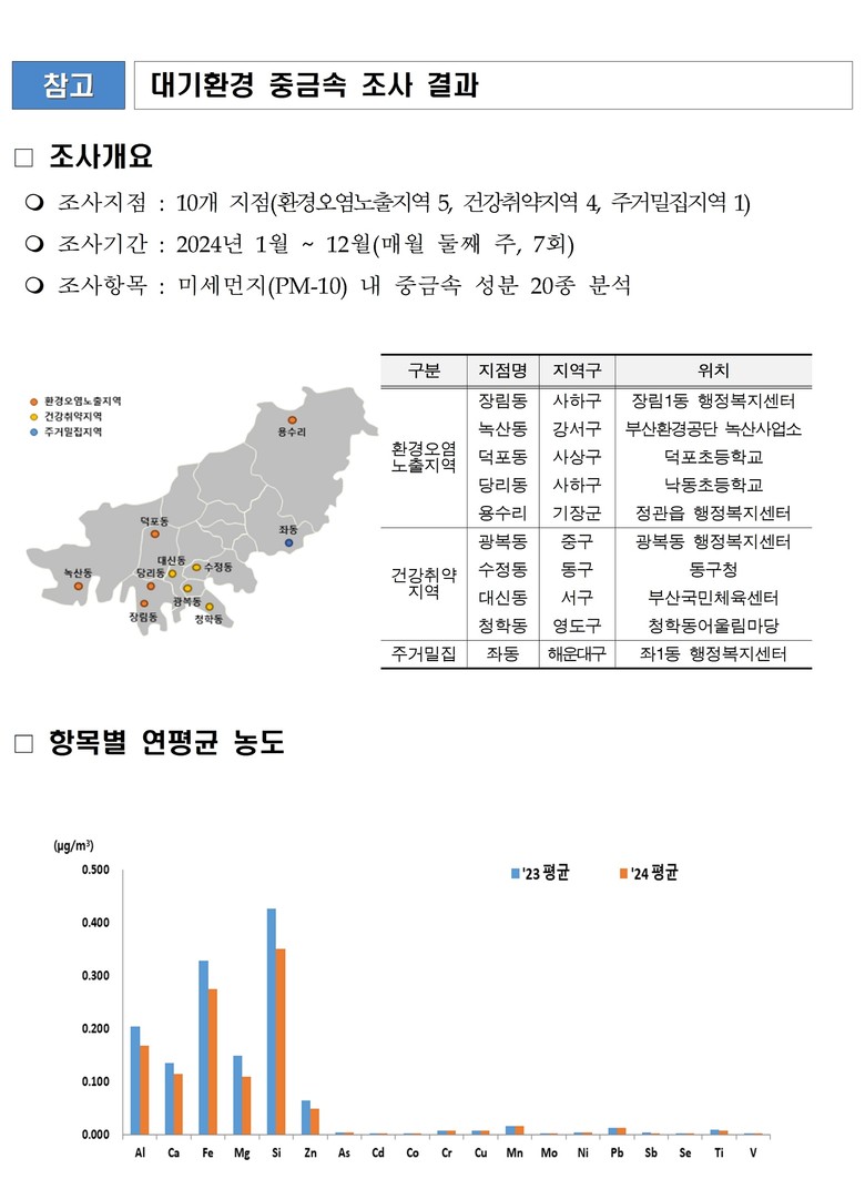 지역별로는 환경오염 노출 지역 중에서는 사하구 장림동, 강서구 녹산동, 사상구 덕포동에서 중금속 농도가 상대적으로 높게 나타났다. 반면, 주거밀집 지역인 해운대구 좌동은 비교적 낮은 농도를 유지하며 안정적인 대기 환경을 보였다.