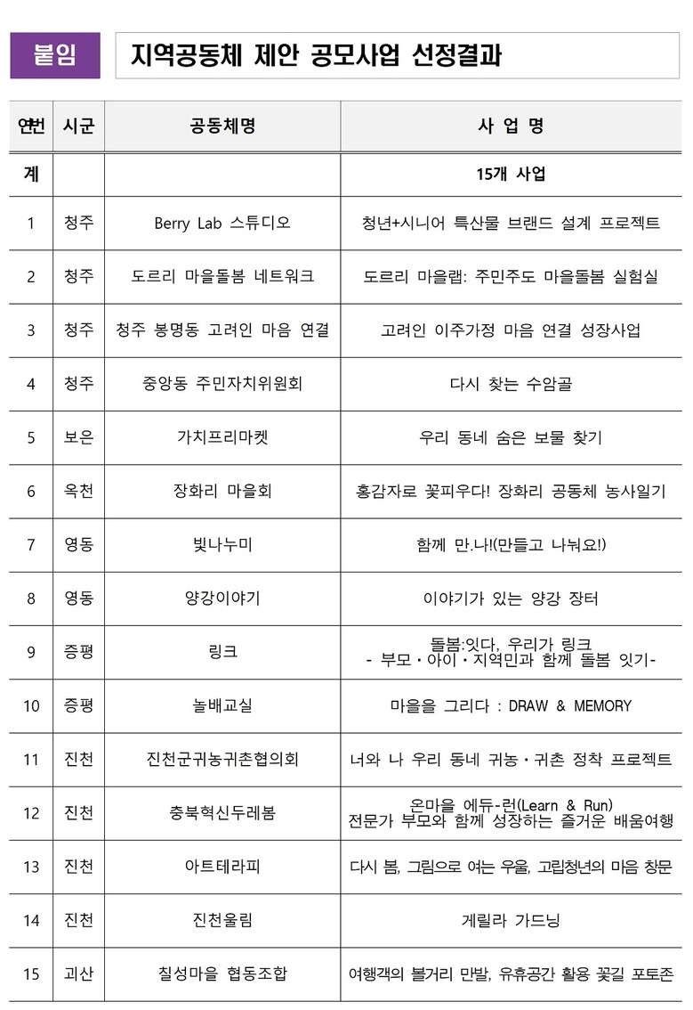 선정된 사업은 청주의 ‘도르리 마을돌봄 네트워크(도르리 마을랩: 주민주도 마을돌봄 실험실)’, 옥천의 ’장화리 마을회(홍감자로 꽃피우다! 장화리 공동체 농사일기)‘, 증평의 ‘링크(돌봄:잇다, 우리가 링크–부모·아이·지역민과 함께 돌봄 잇기-)’, 진천의 ‘진천울림(게릴라 가드닝)’ 등이다.