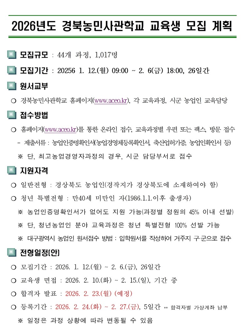 [경북 세계타임즈=한윤석 기자] 경상북도는 이달 12일부터 다음달 6일까지 26일간 2026년도 경북농민사관학교 44개 교육과정에 대하여 1,017명의 교육생을 모집한다.