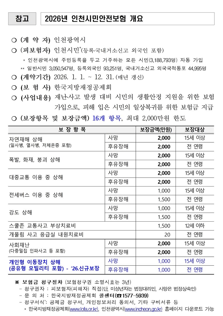 인천시민안전보험은 예상치 못한 다양한 위험 상황으로 피해를 입은 시민에게 보험금 지급해 생활 안정을 돕는 제도로, 인천시는 2026년 보험의 수혜대상과 보장 항목을 확대해 시민들이 받을 수 있는 혜택을 더욱 강화했다.