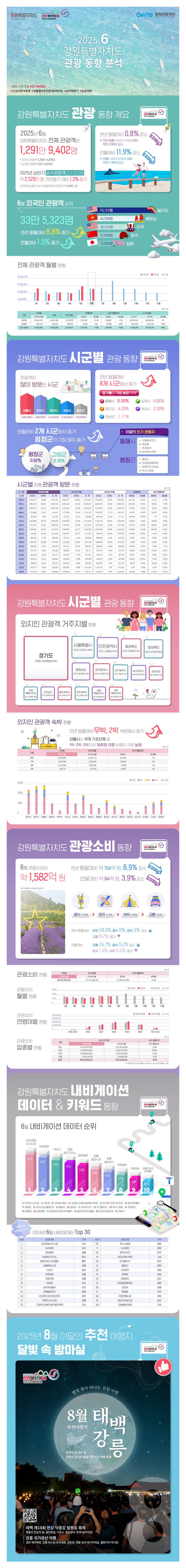 지난 6월 강원특별자치도를 방문한 전체 관광객은 전년 동월 대비 0.8%, 전월 대비 11.9% 모두 감소한 약 1,291만 명이며, 시군별로 확인했을 때, 동해시는 전년 동월대비 가장 높은 관광객 증가율(9.99%)을 기록하였고, 이어서 삼척시(6.66%), 양구군(4.28%), 속초시(2.09%), 정선군(1.17%) 등 순으로 관광객 증가세를 보였다.