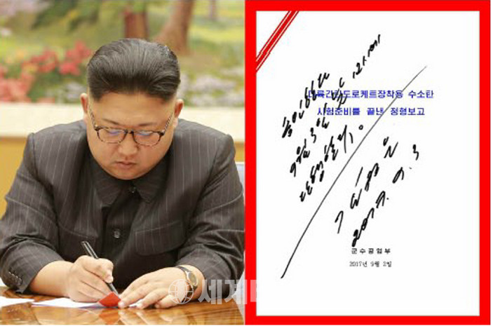 북한 노동신문은 지난 3일 조선노동당 중앙위원회 정치국 상무위원회를 진행됐다고 4일 보도했다. 이 자리에는 김정은 노동당 위원장, 김영남, 황병서, 박봉주, 최룡해가 참석했다. 노동신문에 따르면 조선노동당 상무위원회에서는 '국가핵무력완성의 완결단계목표를 달성하기 위한 일환으로 대륙간탄도로켓장착용 수소탄시험을 진행할데 대하여'가 채택됐으며 김정은 위원장이 시험 단행에 대한 명령서에 친필서명을 했다고 밝혔다. 2017.09.04. (출처=노동신문)