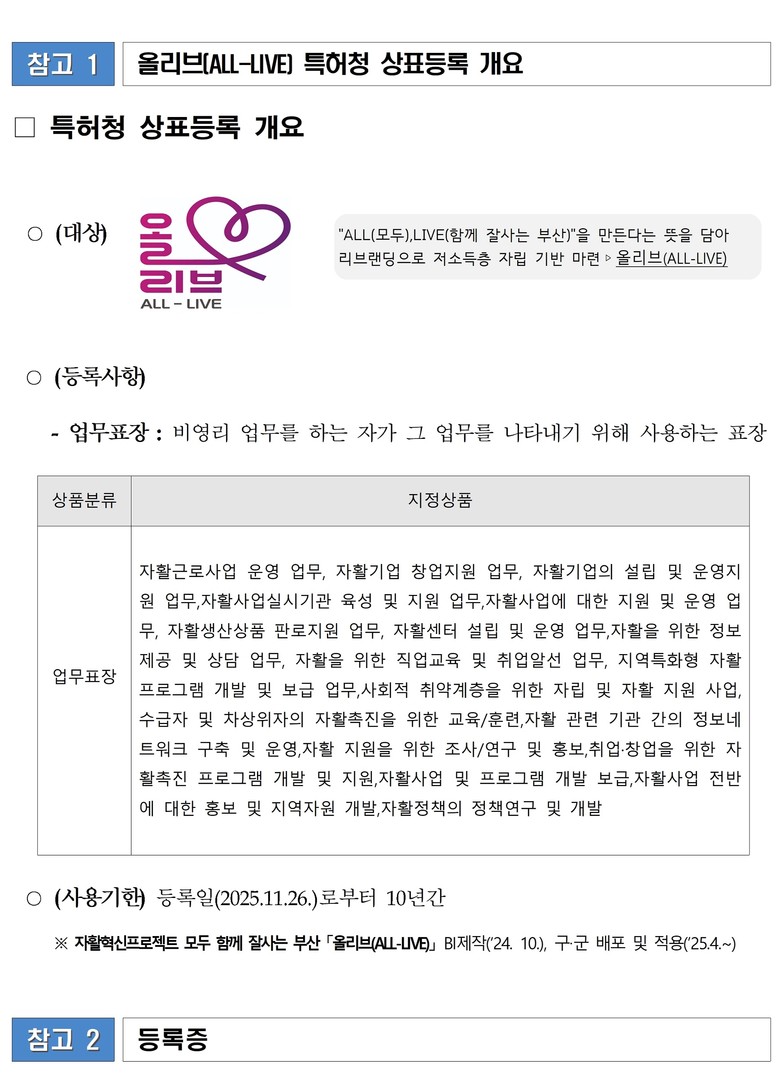 박형준 시장은 “이번 '올리브(ALL-LIVE)' 정책 브랜드 상표 등록은 자활을 넘어 '모두 함께 잘 사는 부산'을 실현하기 위한 부산형 자활 혁신 브랜드의 의미 있는 결실”이라며, “상표 등록을 계기로 우리시 자활정책 전반에 브랜드를 일관되게 적용하고, 올리브를 자활 우수 모델로서 전국으로 확산하도록 더욱 노력하겠다”라고 전했다.