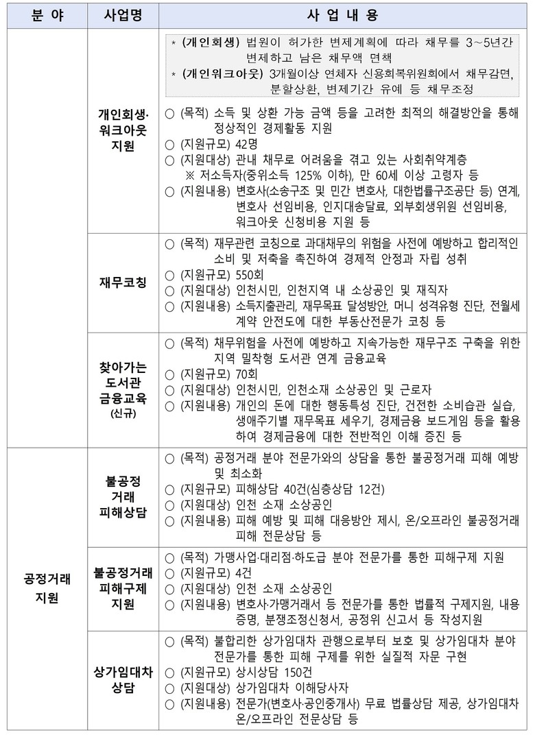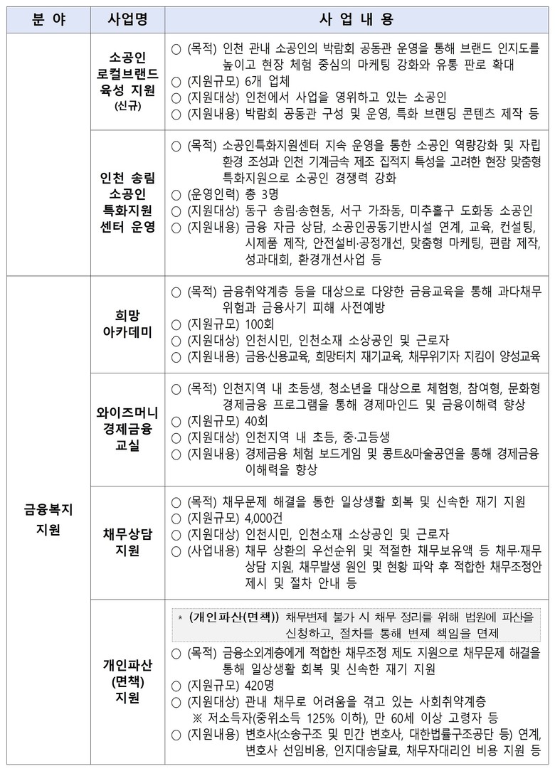 [인천 세계타임즈=심하린 기자] 인천광역시(시장 유정복)는 경기 둔화와 고물가·고금리 등으로 어려움을 겪고 있는 소상공인과 금융취약계층을 지원하기 위해 총 39억 원 규모의 예산을 투입해 인천소상공인종합지원센터를 중심으로 각종 지원사업을 본격 시행한다고 밝혔다.