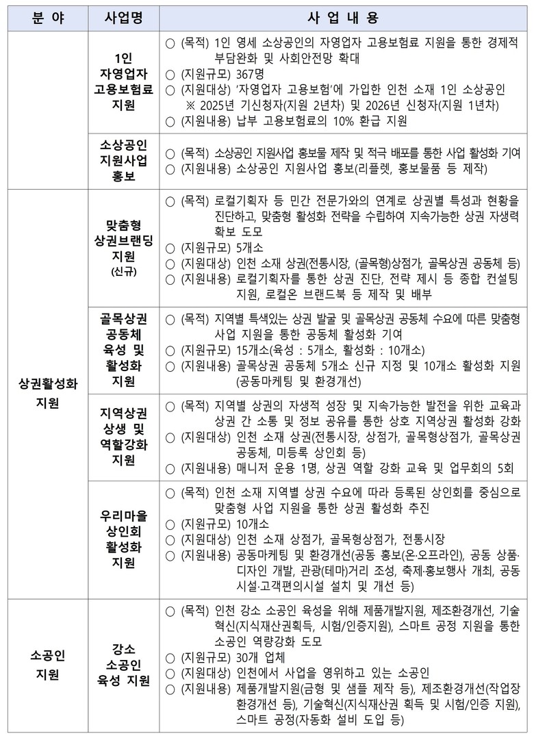 창업 초기 소상공인의 부담 완화를 위해 ‘인천 골목창업 첫걸음 지원사업’과 지역 특색을 반영한 ‘특색간판 지원사업’을 새롭게 도입한다. 이와 함께 점포 환경 및 위생·안전 개선을 지원하는 경영환경개선 사업과 지역방송과 연계한 판로개척 사업 등을 통해 매출 증대와 경쟁력 강화를 도모한다.