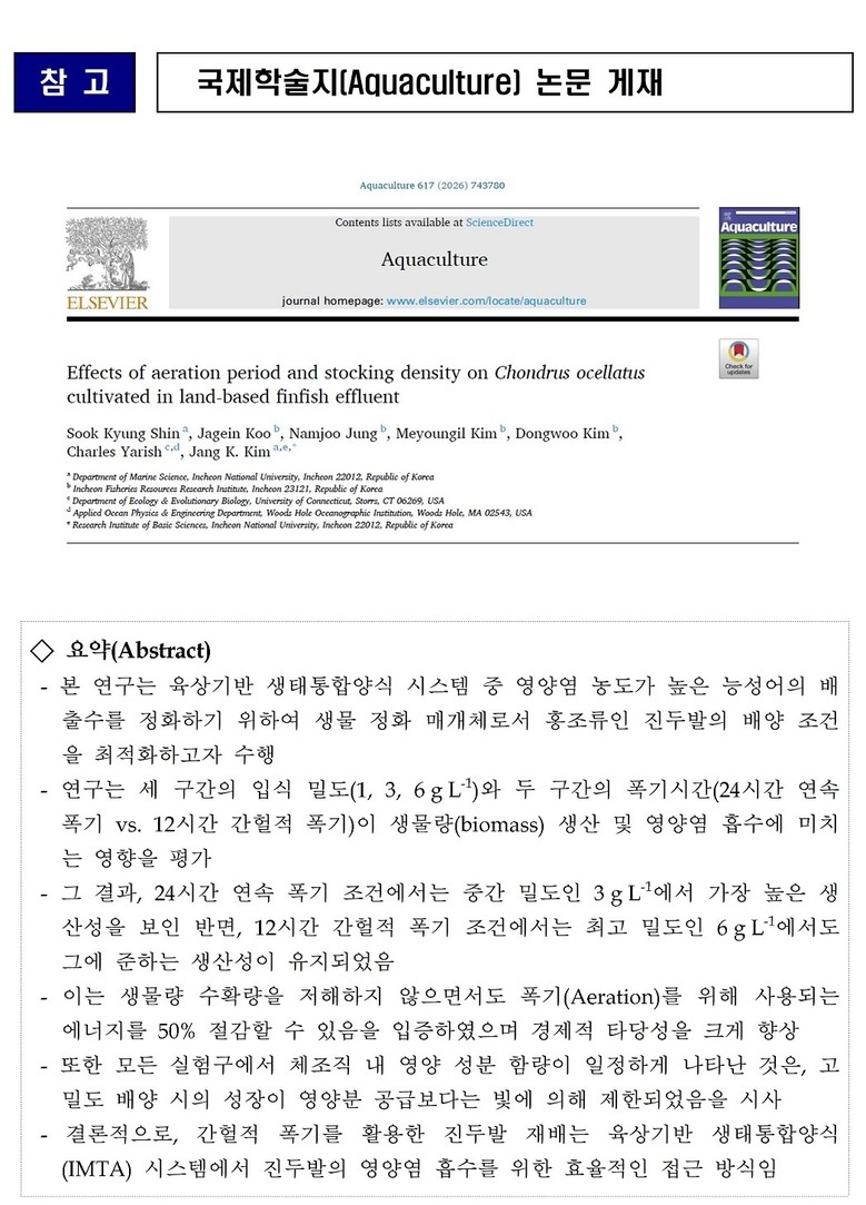 이번 논문이 게재된 ‘아쿠아컬처(Aquaculture)’지는 전 세계 양식 전문가들이 표준 지침으로 삼는 과학기술논문인용색인(SCI(E))급 국제 학술지다. 이번 성과를 통해 인천시의 친환경 양식 기술이 세계적 표준으로 인정받게 됐으며, 이를 계기로 블루카본 관련 분야를 선도해 나갈 수 있도록 해조류 활용 탄소 흡수원 연구를 지속할 계획이다.