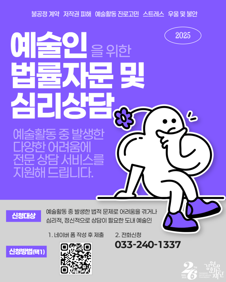 기존에는 예술활동증명을 보유한 도내 예술인만 신청할 수 있었으나, 앞으로는 △최근 2년 내 강원문화재단 지원사업 참여 예술인, △문화예술업종에 종사 중인 도내 예술인, △문화예술용역 계약 체결 도내 예술인도 법률 및 심리상담 지원을 받을 수 있다.