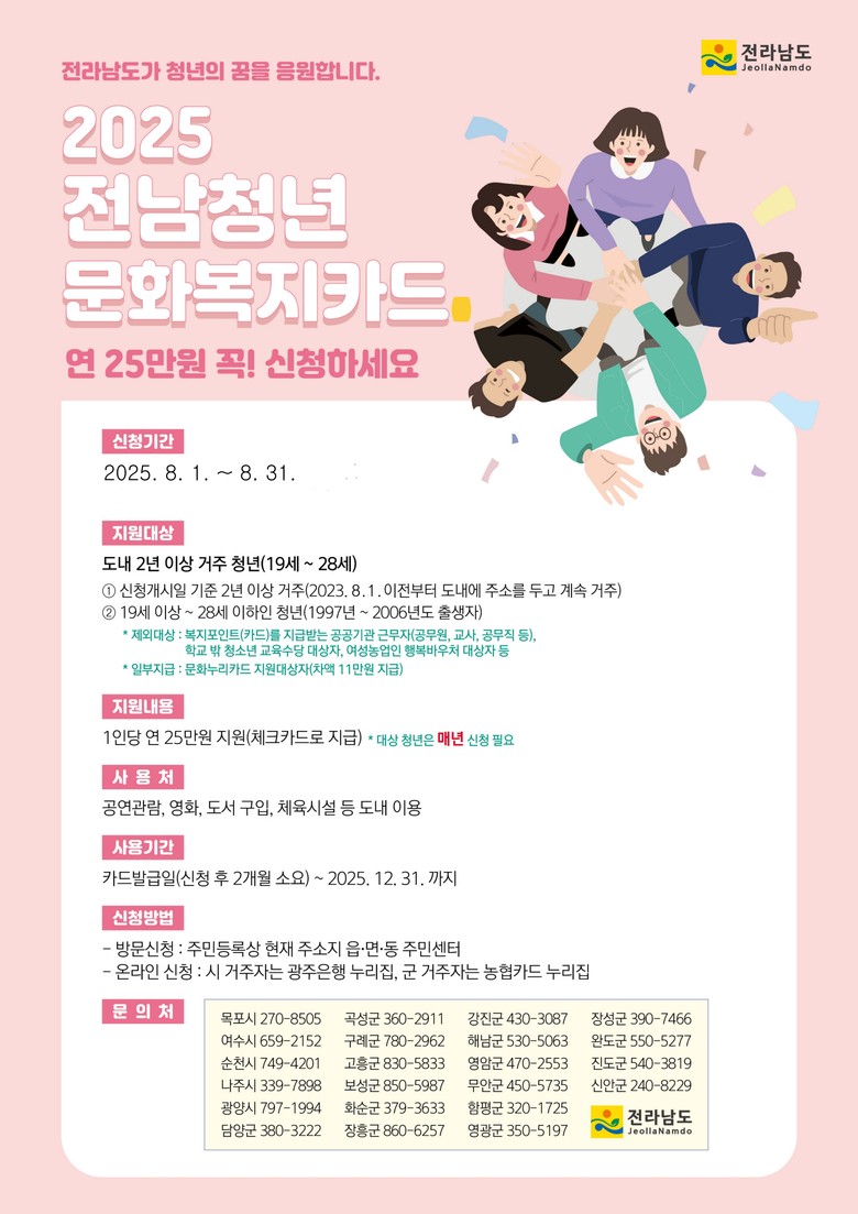 윤연화 전남도 인구청년이민국장은 “전남청년 문화복지카드 사업이 청년의 문화·여가 활동을 활성화하고 지역 문화산업에도 긍정적 영향을 주고 있다”며 “지역 청년의 문화 활동 격차 해소를 위해 많은 신청 바란다”고 말했다.