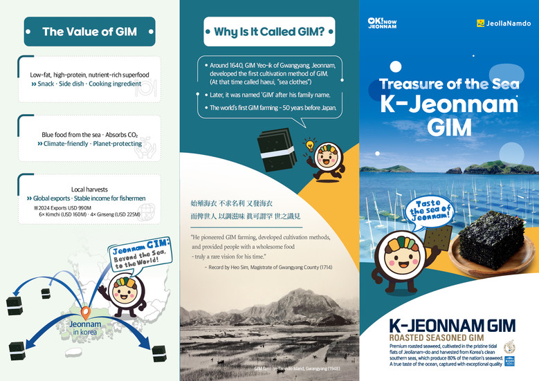 팸플릿에는 ‘왜 김이라 부를까’라는 코너를 마련해 1640년께 전남 광양에서 김여익이 김 양식법을 최초로 개발했고, 그의 성을 따 ‘김’이라 불리게 된 이야기를 소개했다. 또한 1714년 당시 광양군 현감 허심의 기록을 인용해 ‘처음으로 김 양식을 시작해 김 양식법을 개발했으며, 세상 사람들에게 좋은 음식을 조리케 하였으니 세상에 드문 식견이 아니겠는가’라는 구절을 실어 전남이 세계 최초 김 양식의 본고장임을 강조했다. 이밖에도 김의 영양성분과 건강·다이어트·성장 효과, 김부각·김밥·김자반 등 글로벌 활용법을 인포그래픽으로 구성해 시각적 이해도를 높였다.