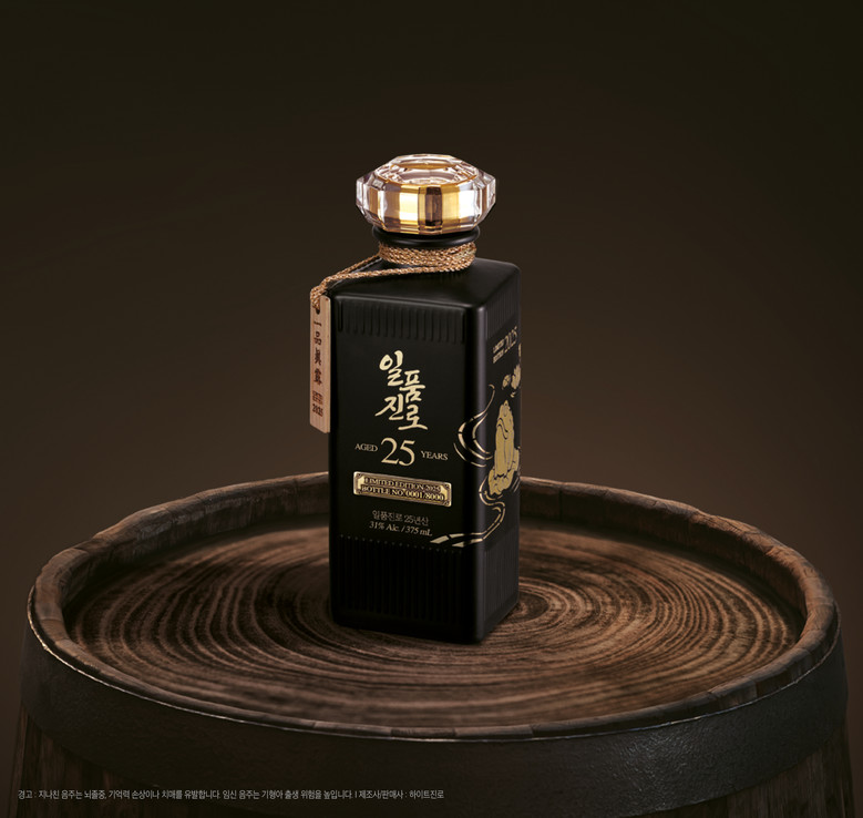 ‘일품진로 25년산’은 풍미가 가장 뛰어난 중간층 원액만을 선별해 25년 이상 숙성한 제품으로, 목통의 위치를 주기적으로 바꾸고 교체하는 등 긴 시간 동안 최적의 온도와 습도를 맞춰 탄생했다. 오크통 숙성 특유의 스모키한 향미와 함께 바닐라·체리·초콜릿 리큐어 같은 깊고 부드러운 단맛이 특징이다.