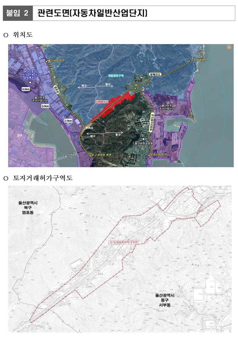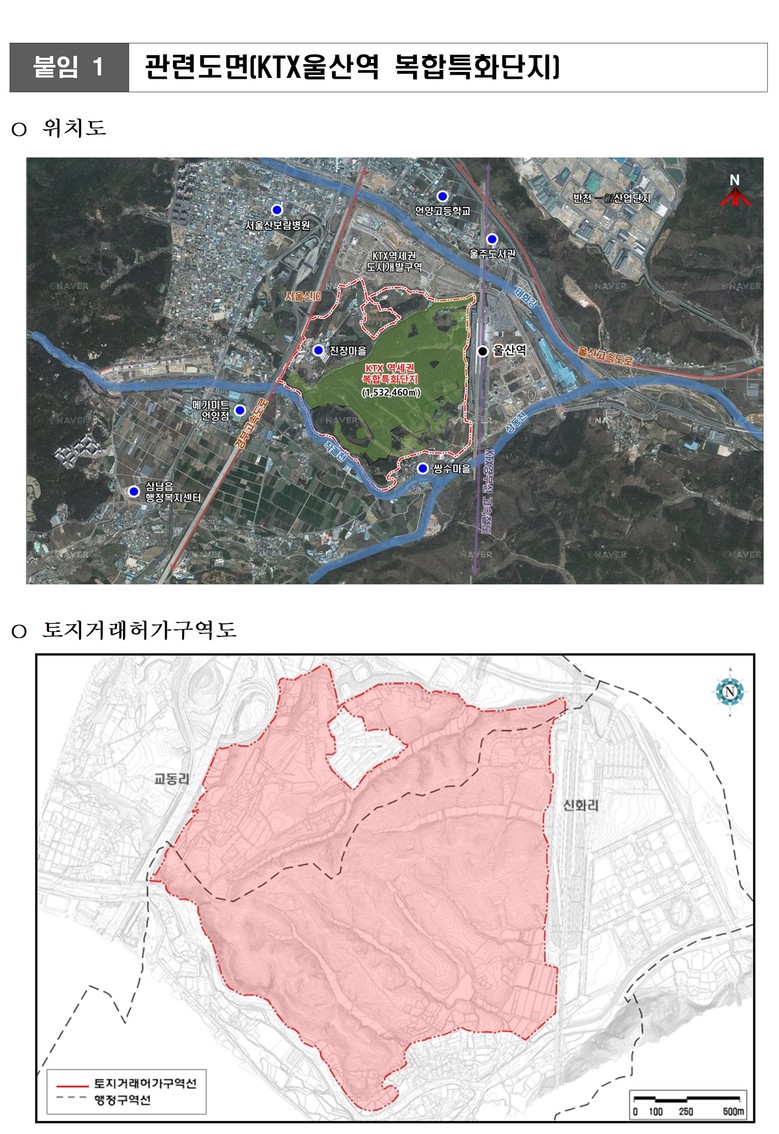 올해 2월 1일부터 내년 1월 31일까지 1년간 토지거래 제한 등 연장 [울산 세계타임즈=이호근 기자] 울주군 삼남읍 신화리·교동리 일원의 ‘케이티엑스(KTX) 역세권 복합특화단지’와 동구 서부동, 북구 염포동 일원의 ‘자동차일반산업단지’가 토지거래허가구역으로 재지정된다.