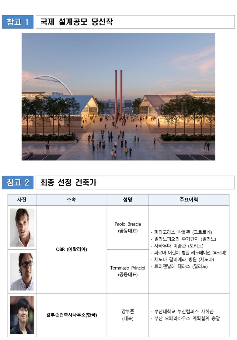 지난 5월 7일 2단계 설계공모 심사를 거쳐, 37대 1이라는 높은 경쟁률을 뚫고 OBR(Open Building Research, 이탈리아, 대표 Paolo Brescia & Tommaso Principi), ㈜강부존건축사사무소(한국, 대표 강부존)로 구성된 건축팀이 최종 선정됐다.