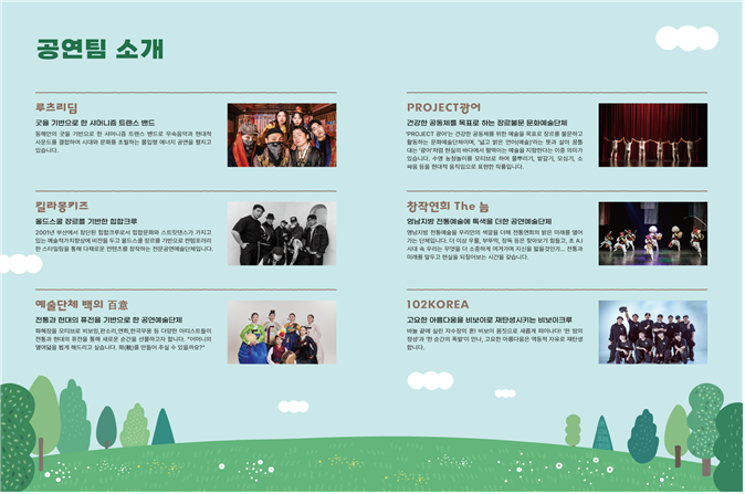 공연에는 부산을 기반으로 활동하는 6개 팀이 참여해, 무형유산의 과장(科場) 변형, 무형유산 간 융합, 전통요소에 현대적 예술을 접목한 10~15분 이내의 창작 작품을 선보인다.