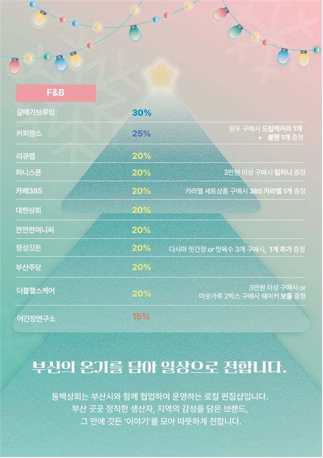◈ 시, 「동백상회」가 단순한 판매 공간을 넘어 지역기업의 브랜드와 경쟁력을 키워가는 플랫폼으로 자리매김할 수 있도록 적극 지원할 계획 [부산 세계타임즈=이용우 기자] 부산시(시장 박형준)와 부산경제진흥원(원장 송복철)은 부산 우수 제품 쇼핑 숍 「동백상회」에서 12월 31일까지 송년 감사 특별 할인 행사를 개최한다고 밝혔다.