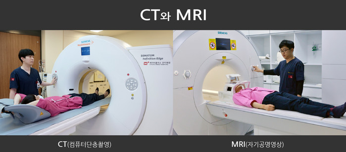 뼈와 장기 관찰에 탁월한 CT, 연부조직, 혈관, 신경 관찰에 효과적인 MRI