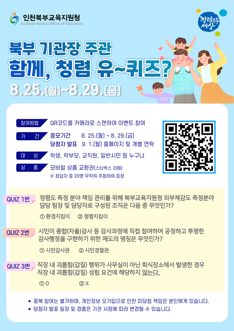 이번 행사는 학생, 학부모, 일반시민 누구나 QR코드로 간편하게 참여할 수 있으며, 퀴즈를 풀며 북부교육지원청의 청렴정책과 갑질 근절 노력에 대한 이해를 높일 수 있도록 기획되었다.