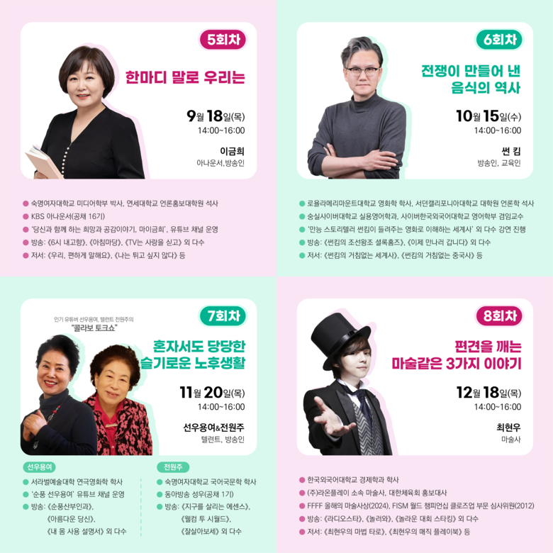 이어 ▲10월 15일은 방송인 썬 킴의 ‘전쟁이 만들어 낸 음식의 역사’ ▲11월 20일은 선우용여와 전원주가 함께하는 ‘혼자서도 당당한 슬기로운 노후생활’ ▲12월 18일 마지막 강연은 마술사 최현우의 ’편견을 깨는 마술 같은 3가지 이야기‘를 강연할 예정이다.