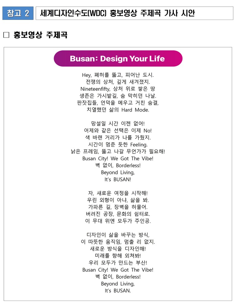 특히 주제곡 「부산: 디자인 유얼 라이프(Busan: Design Your Life)」는 전쟁의 폐허 속에서 일어선 부산의 역사에서 출발해, 디자인이 시민의 삶을 변화시킨 도시의 여정을 힙합 리듬과 인공 지능(AI) 그래픽으로 재해석했다.