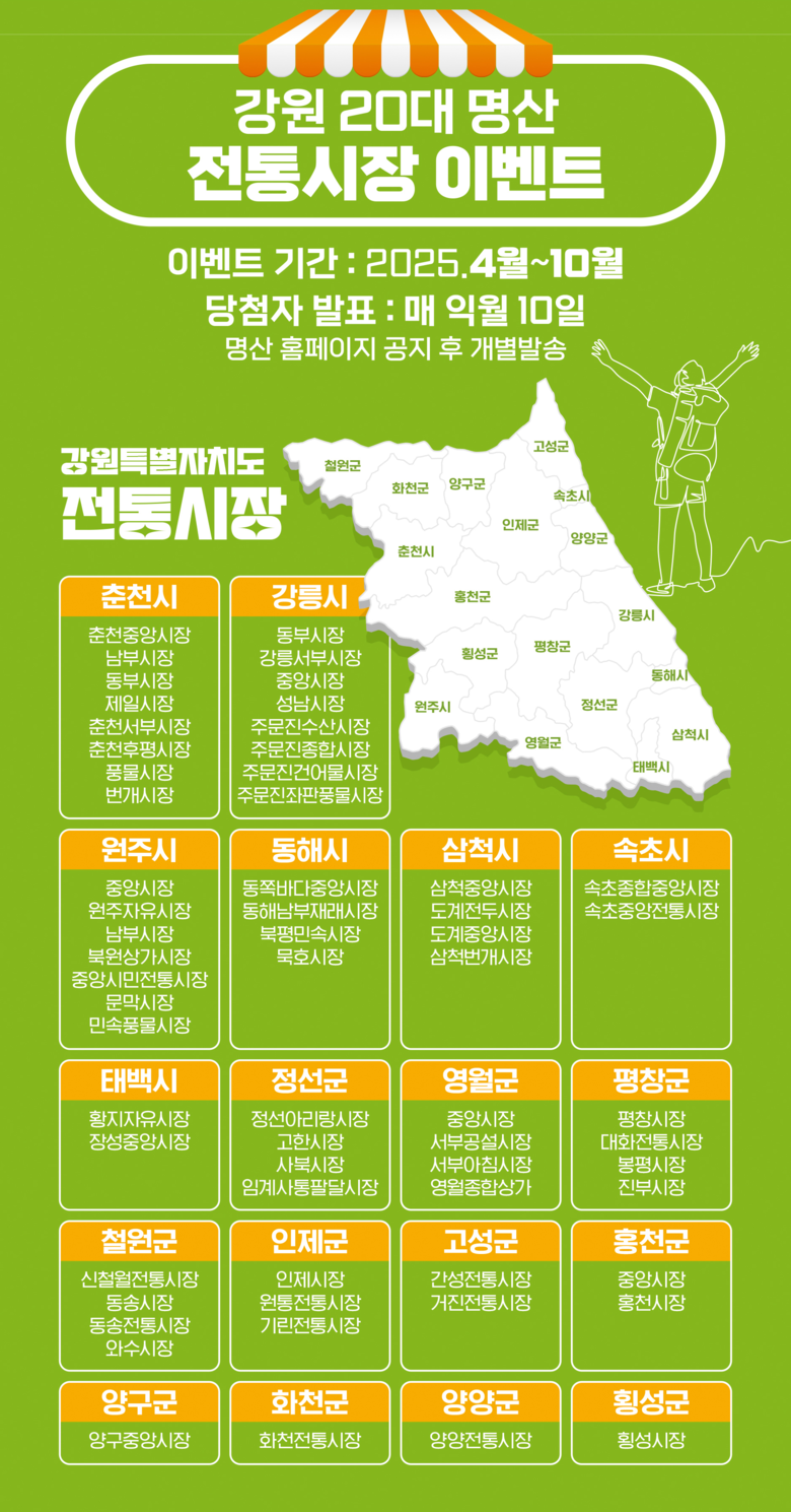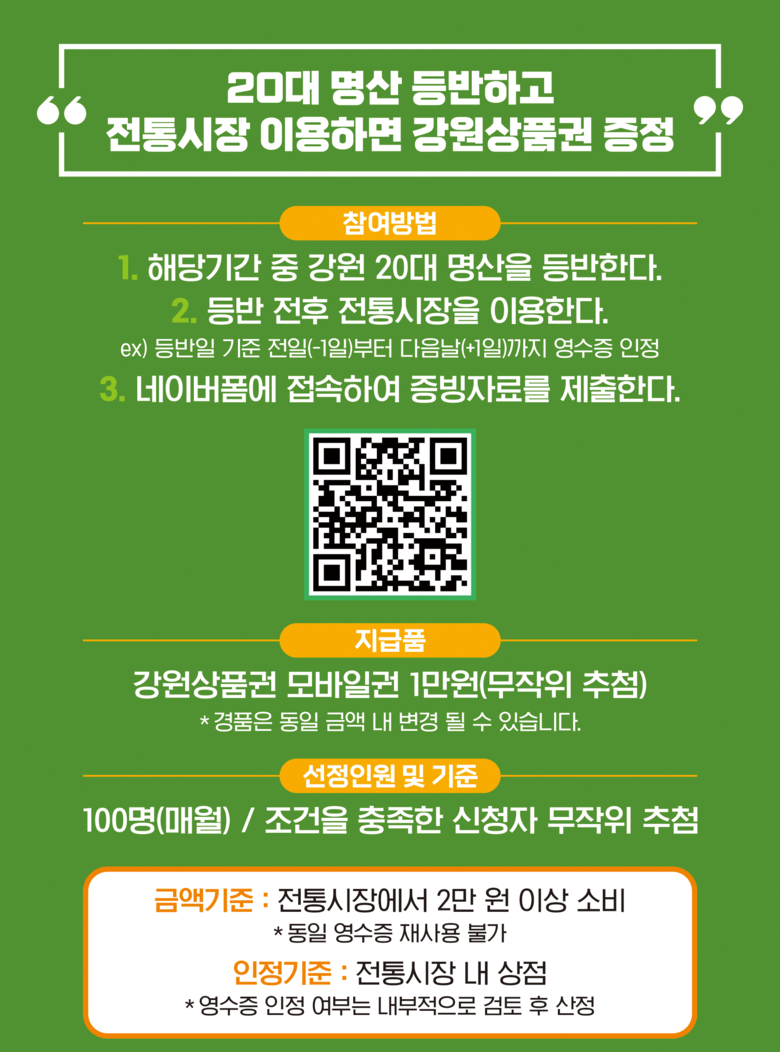 재단은 4월부터 10월까지 강원 20대 명산과 도내 18개 시군의 62개 전통시장과 연계한 이벤트를 진행한다. 강원 20대 명산 등반 후, 전통시장에서 결제한 영수증을 증빙하여 이벤트 신청을 완료하면 된다. 증빙을 완료한 100명의 신청자에게는 무작위 추첨을 통해 지역상품권을 지급할 예정이다.