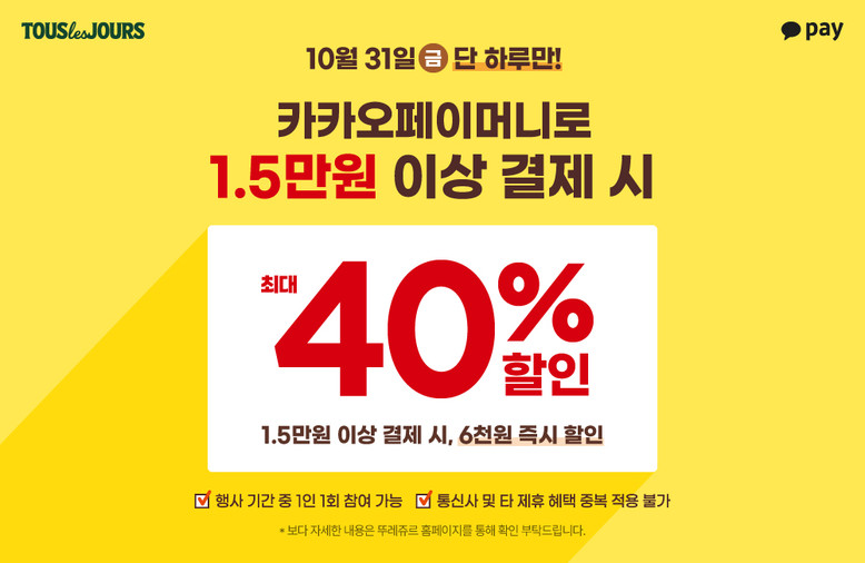 이번 행사는 31일 오전 9시부터 진행되며 뚜레쥬르 오프라인 매장에서 카카오페이머니로 결제 시 최대 40% (최대 6천원)을 즉시 할인해 준다. 1인 1회 참여 가능하며, 타 제휴 프로모션과의 중복 할인이나 적립, MMS 사용은 불가하다. 자세한 사항은 카카오페이앱 또는 카카오톡 내 카카오페이홈의 결제탭에서 확인할 수 있다.