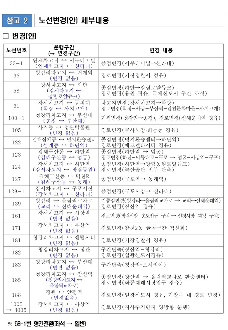 총 40개 노선을 대상으로 하며, 6개 노선 신설, 20개 노선 변경, 8개 노선 폐지, 기타 6개 노선을 조정한다. 변경 및 폐지된 노선에는 대체 노선 공급 또는 수요응답형 교통(DRT) '타바라' 운행을 통해 시민 불편을 최소화한다.